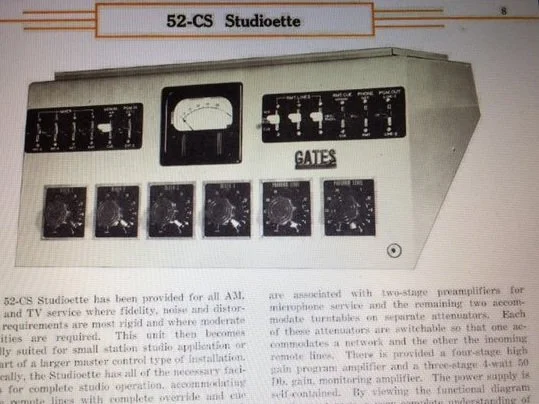 The studio was equipped with a Gates Radio Board, named the Studioette, which is a single channel monophonic console.